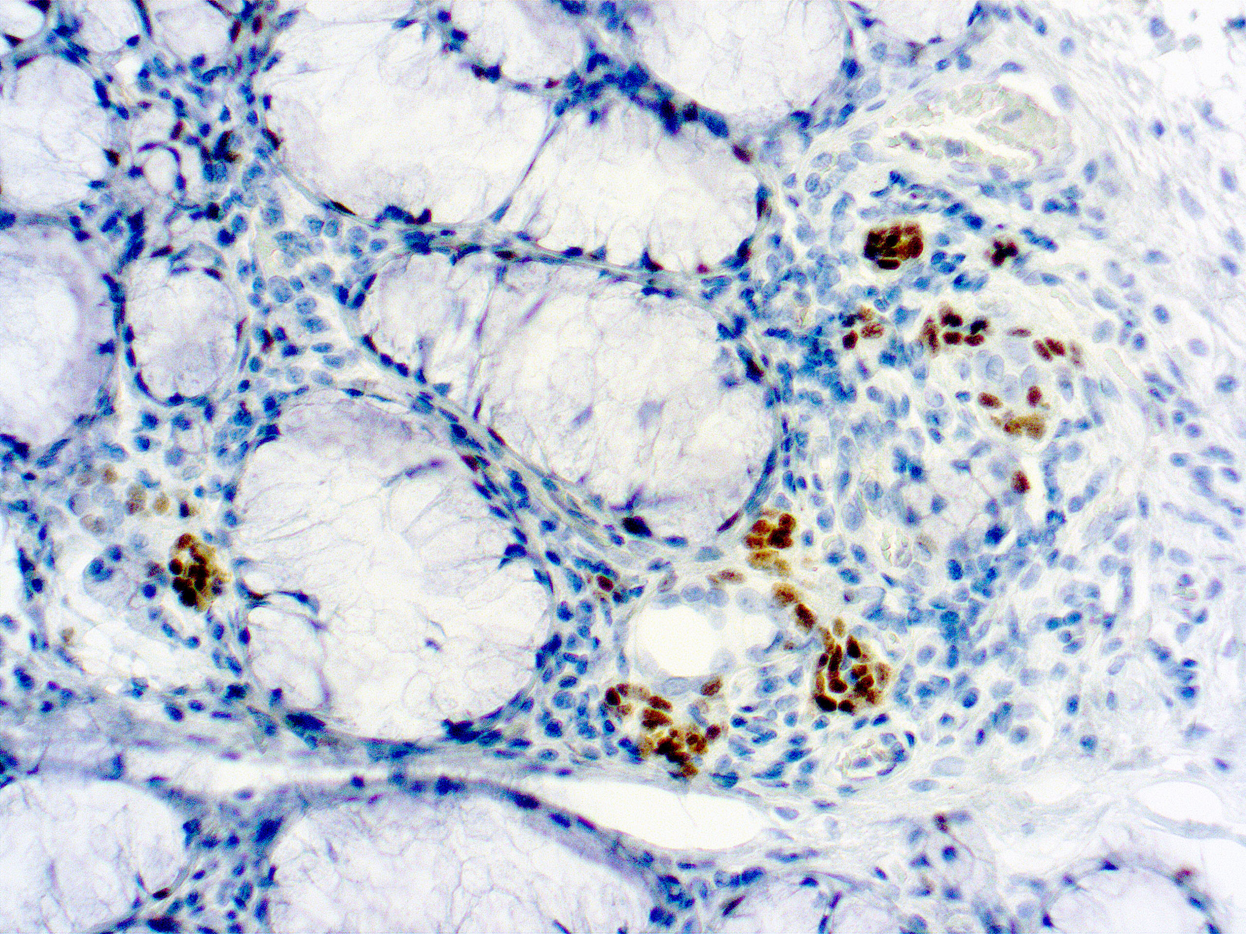Specificity: This antibody is specific to Synacthen (aa 1-24 of ACTH); this antibody does not react with CLIP (aa 17-39 of ACTH). Anti-ACTH is a useful marker in classification of pituitary tumors and in the study of pituitary disease. It reacts with ACTH-producing cells (corticotrophs). It also may react with other tumors (e.g. some small cell carcinomas of the lung) causing paraneoplastic syndromes by secreting ACTH.