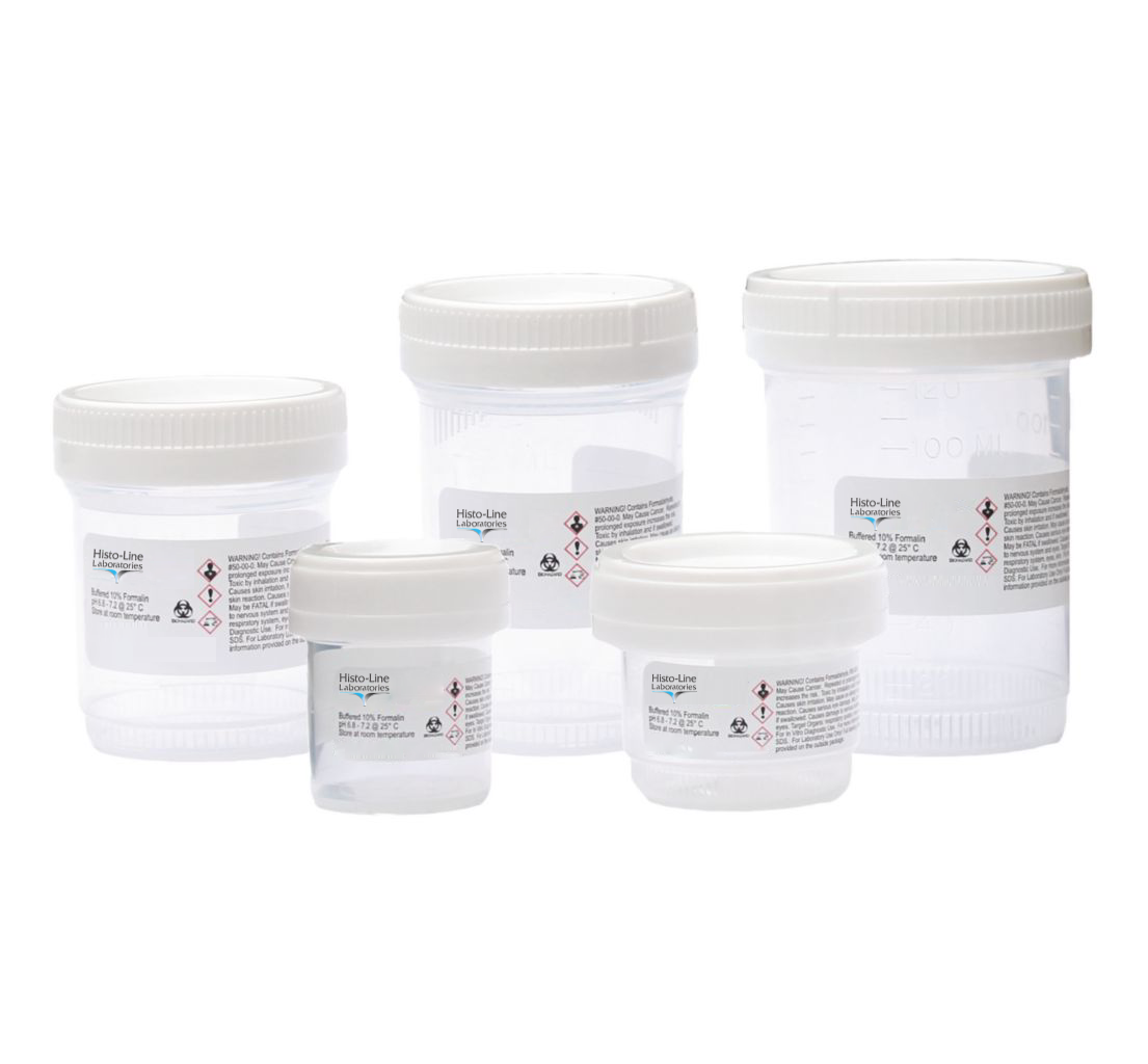 Recipiente hecho de acuerdo con la legislación de la UE precargado con formol u otros fijadores. Los recipientes están hechos de HDPE (polietileno de alta densidad).