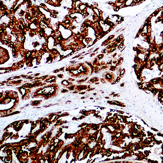 Prostate-specific membrane antigen (PSMA), also known as folate hydrolase 1(FOLH1), is a type II transmembrane glycoprotein belonging to the M28 peptidase family. PSMA has two enzymatic activities, one as a prostate-specific integral membrane folate hydrolase and the other as a carboxypeptidase Anti-PSMA labels normal prostate epithelial cells and prostate tumor cells. Although the expression of PSMA in neovasculature of a variety of solid tumors has been reported, PSMA expression is highly restricted to the prostate. It is a useful marker for prostate tumors. In prostate cancer, overexpression of PSMA is correlated with high tumor grade, non-diploid tumors, and advanced tumor stage. It can be used as an effective predictor for tumor progression in prostate cancer.