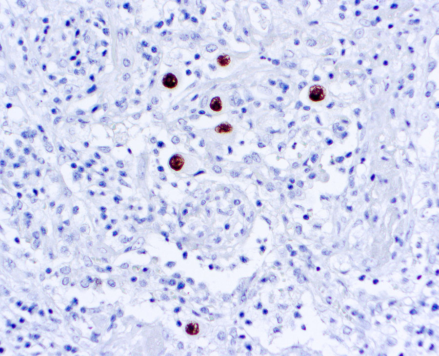 This cocktail antibody stains infected cells giving a nuclear staining pattern with an immediate early and an early CMV antigen.