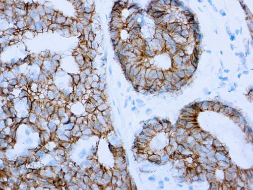 E-cadherin (uvomorulin, cell-CAM120/80) is a calcium dependent cell adhesion molecule expressed predominately in epithelial tissues. It plays an important role in the growth and development of cells via the mechanisms of control of tissue architecture and the maintenance of tissue integrity. Numerous studies have demonstrated that reduction and/or loss of E-cadherin expression in carcinomas correlates positively with the potential of these tumors for invasion and metastasis.