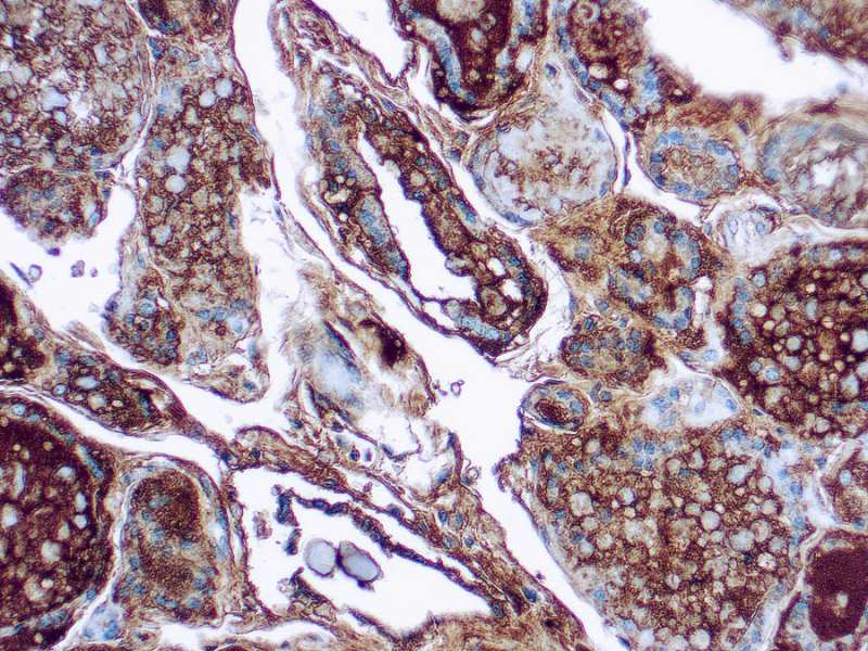This antibody recognizes thyroglobulin in hyperplastic and neoplastic thyroid. Thyroglobulin is a protein of 670 kDa consisting of two identical subunits. Thyroglobulin is synthesized by the follicular epithelial cells of the thyroid.