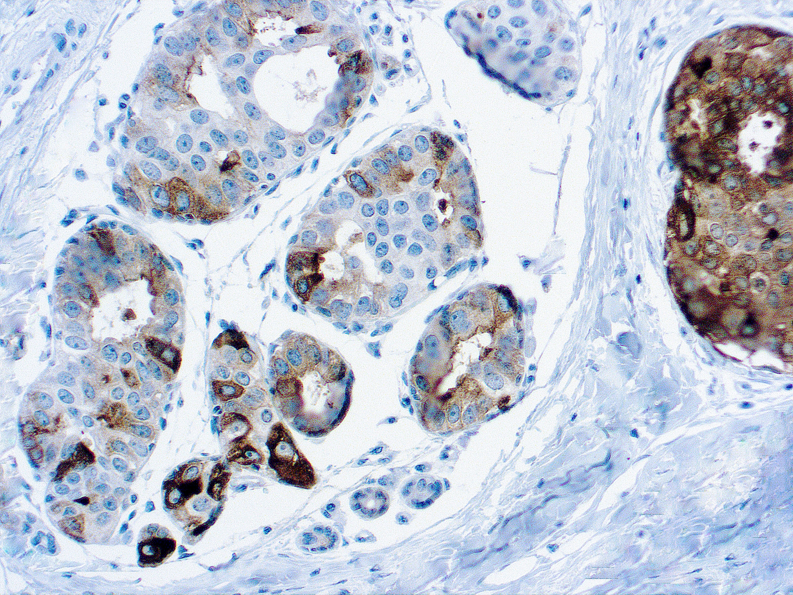 It recognizes a protein of 15kDa, identified as Gross cystic disease fluid protein 15 (GCDFP-15). It is a major protein component of benign breast gross cysts. It is a known marker of breast cancer, as it is found in approximately 50% of all breast cancer specimens. GCDFP-15, also known as PIP, for prolactin inducible protein, is a prolactin and androgen controlled protein. This antibody is useful in the identification of metastatic breast carcinoma, or fluid analysis.