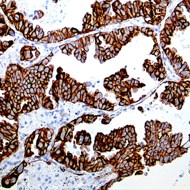 Cytokeratin 7 is expressed in epithelial cells of ovary, lung and breast. It is often used in conjunction with cytokeratin 20 and CDX-2 in distinguishing pulmonary, ovarian and breast carcinomas (CK7+) from most colon carcinomas (CK7-).