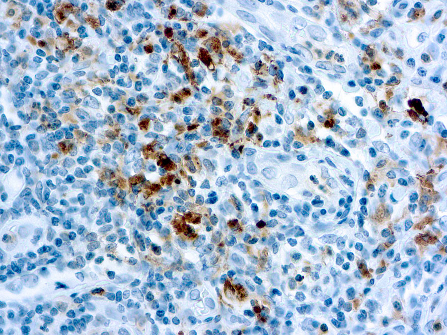 Specificity: This antibody recognizes the a-smooth muscle form of actin. It shows no cross reaction with actin from fibroblasts (b- and g-cytoplasmic), striated muscle (a-sarcometric), and myocardium (a-myocardial). Its epitope is composed of the acetyl group and the first 4 amino acids on the N-terminal end of the peptidic chain of a-smooth actin. ScyTek’s 1A4 stains smooth muscle cells in vessel walls, gut wall, and myometrium. Myoepithelial cells in breast and salivary gland are also stained as they also contain this actin.
