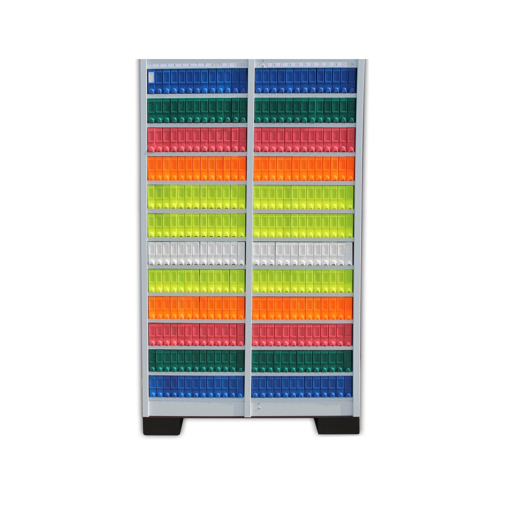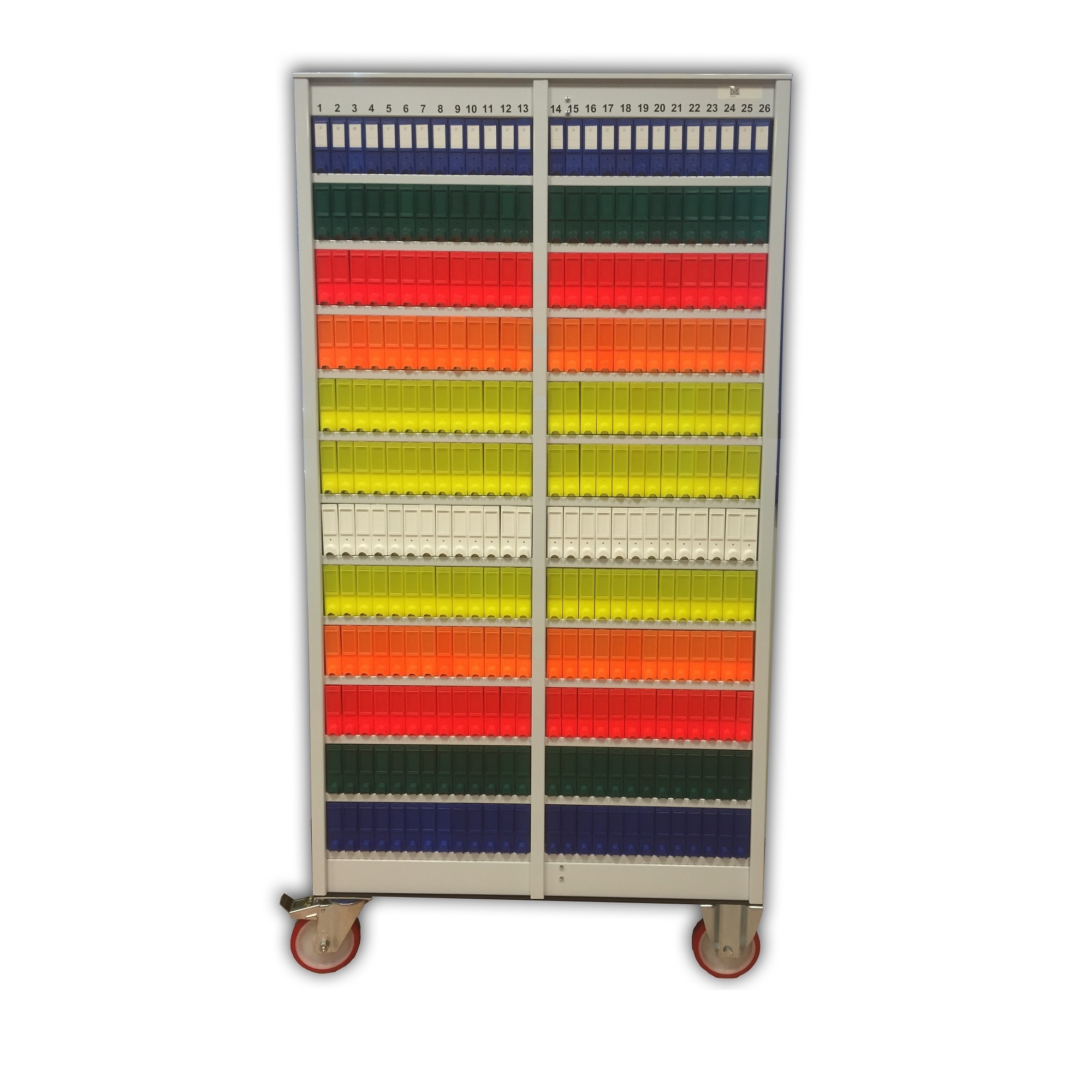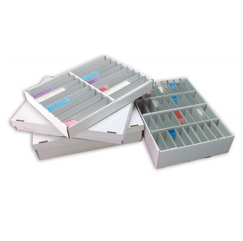 Top slide storage system, metal body complete with 5 rows and 26 ABS trays for each row with coloured fronts (colour on demand). Storage capacity 55.000 slides. Measures (W100xD50xH80 cm). Optional looking doors.
