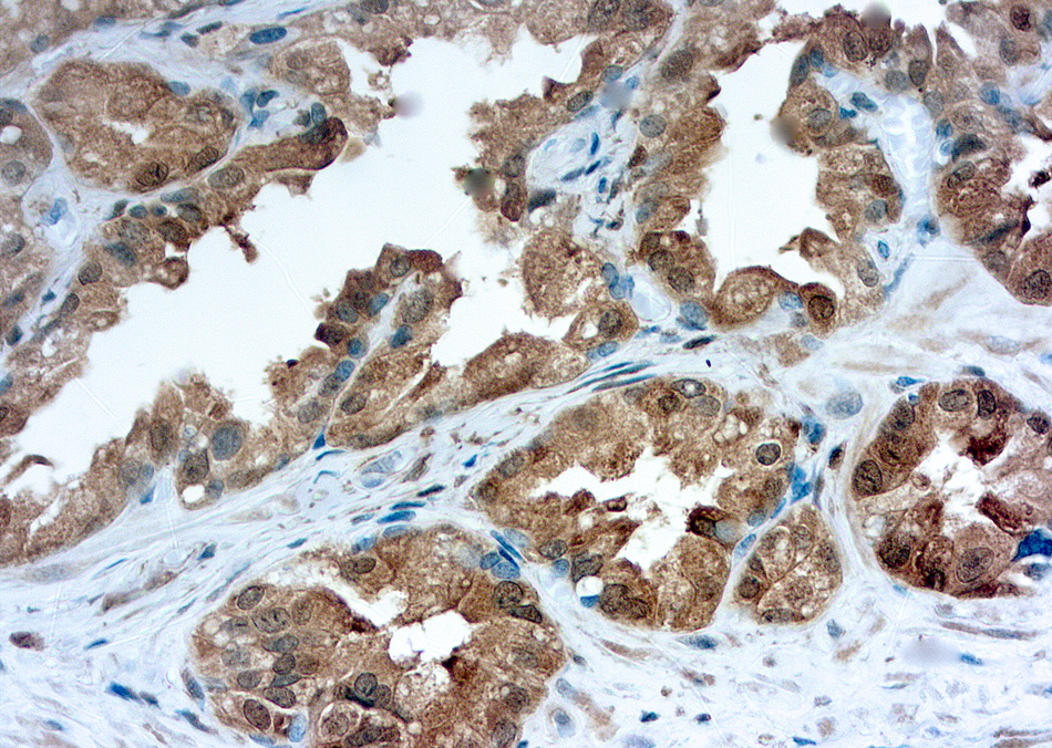 Galectin-3 shows strong diffuse cytoplasmic staining in most cases of papillary thyroid carcinoma (PTC), most poorly differentiated thyroid cancers demonstrate galectin-3 protein expression while it is not expressed in anaplastic thyroid cancers. (1) Upregulated expression of galectin-3 is involved in cancer progression and metastasis, and it is suggested that Galectin-3 may be a valuable tool to support diagnosis of parathyroid carcinoma.