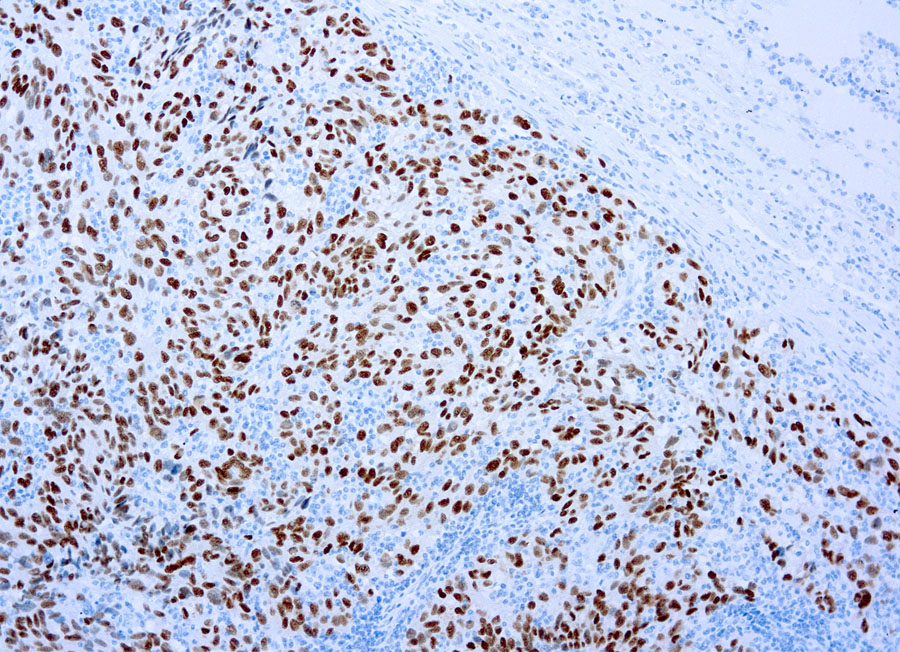 SOX-10, a member of the sex-determining region Y-related HMG-box family, is a transcription factor that is expressed in pre-migratory and migrating neural crest cells. Following migration it remains expressed in cells destined for glial, schwannian, and melanocytic differentiation. SOX10 is widely expressed in normal human tissues including melanocytes and breast tissue. SOX10 is also an important marker in malignant tumors such as melanoma, and breast carcinomas of basal-like and triple negative type, gliomas, and benign tumors such as schwannomas.