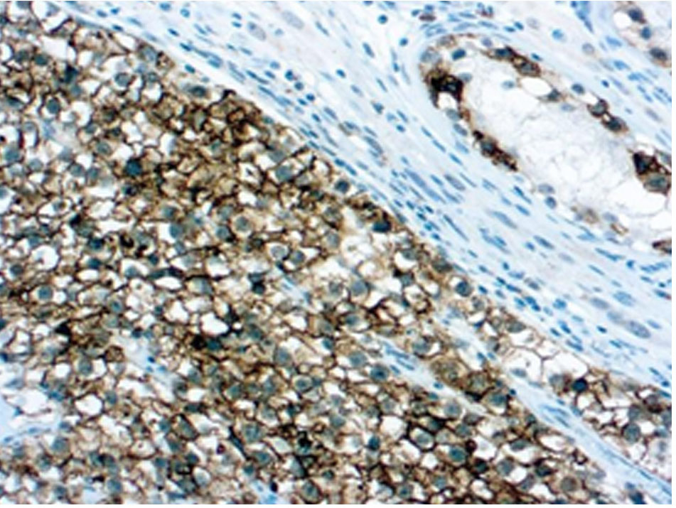 Seminomas, which are germ-cell tumors (GCTs), are divided into two pathological categories: classical and spermatocytic. OCT-4 , a nuclear transcription factor, is a useful diagnostic tool in the identification of classical but not spermatocytic, seminoma. In addition, OCT-4 can be used for the differential diagnosis between yolk sac tumors and seminomas, since OCT-4 does not stain yolk sac tumors. Approximately 80% of seminomas are positive for PLAP (placental alkaline phosphatase) staining. In particular, cell membrane pattern positivity for PLAP is seen in 90-100% of classical seminomas.
