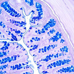 Il colorante Alcian Blue è usato per dimostrare il glicosaminoglicano nelle mucine, per la colorazione di amiloidi, cisteine e per la colorazione policromatica dei mastociti secondo Alcian-Blue Safranin. Viene anche utilizzato per determinare le specie batteriche e rilevare le capsule batteriche. Il kit Alcian Blue pH 1.0 consente un'adeguata colorazione e visualizzazione di mucopolisaccaridi fortemente solfati senza colorare le mucine acide carbossilate o le mucine neutre. I nuclei cellulari sono colorati di rosso usando una controcolorazione.